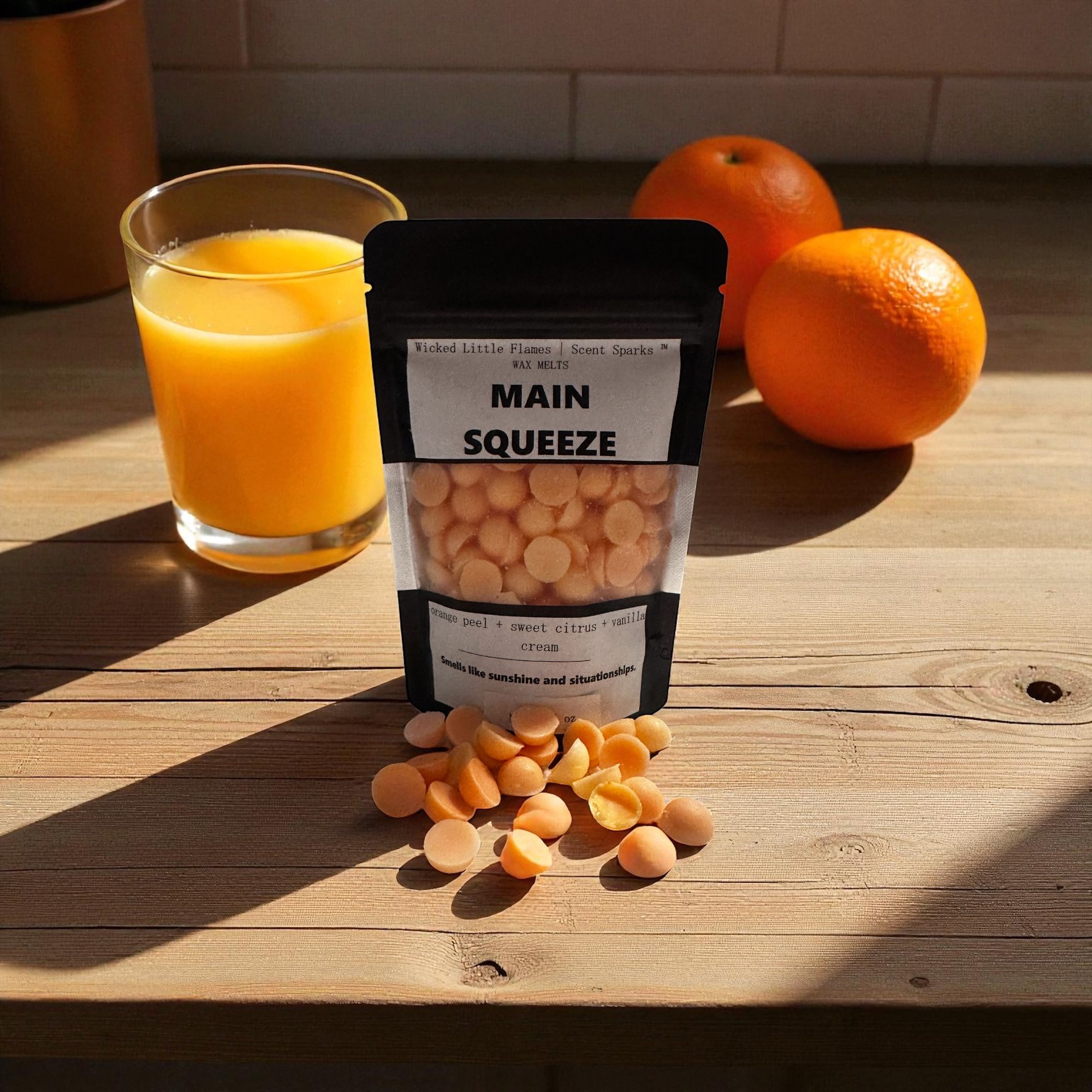 “Main Squeeze” smells like the person you SWEAR isn’t your type… until they smile at you. Zesty orange peel hits first with that juicy little spark, sweet citrus keeps things bubbly and playful, and vanilla cream wraps around it all like a warm hug you pretend you don’t need.